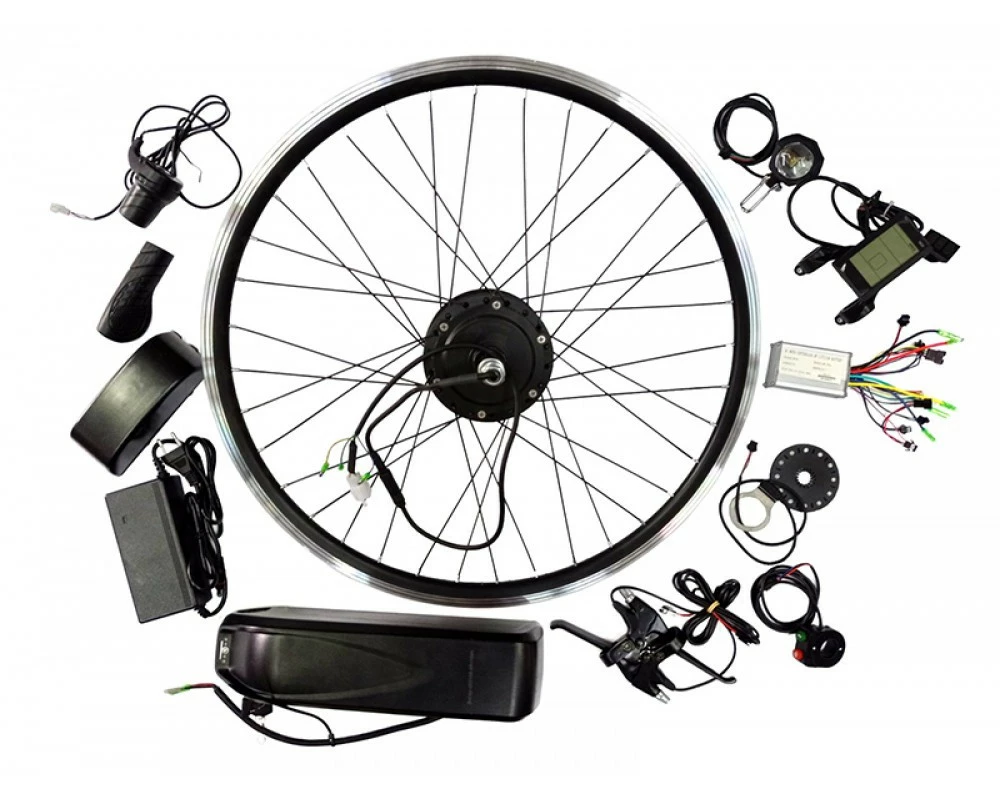 Комплект із переднім мотор-колесом на 28 дюймів. У цьому наборі є все необхідне для швидкого та легкого переобладнання вашого велосипеда. На ободі є гальмівні доріжки для V-brake гальм, а на моторі є кріплення для гальмівного ротора (кріплення 6 болтів) — все це робить комплект універсальним і відповідним практично для будь-якого велосипеда з колесами діаметром 28 дюймів.